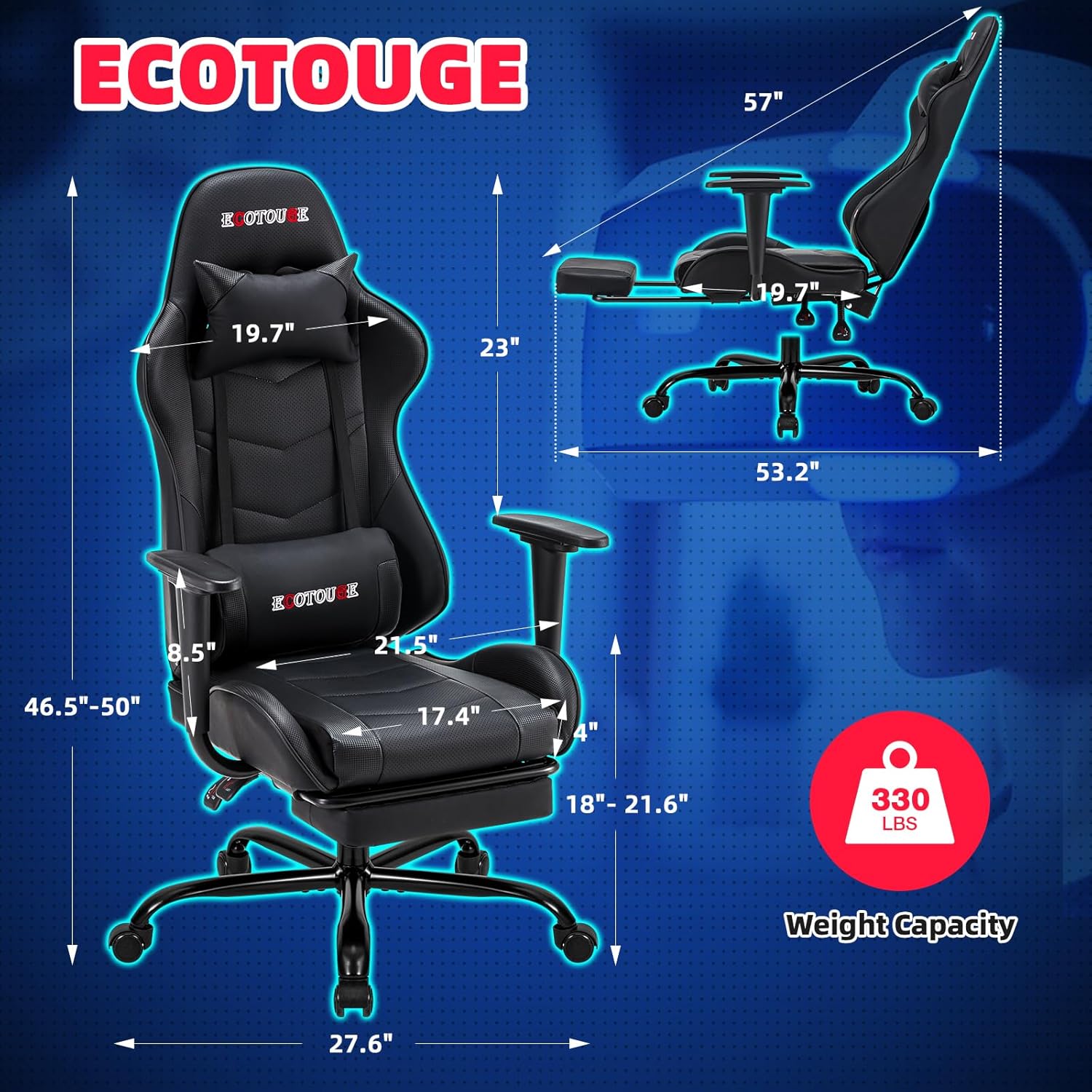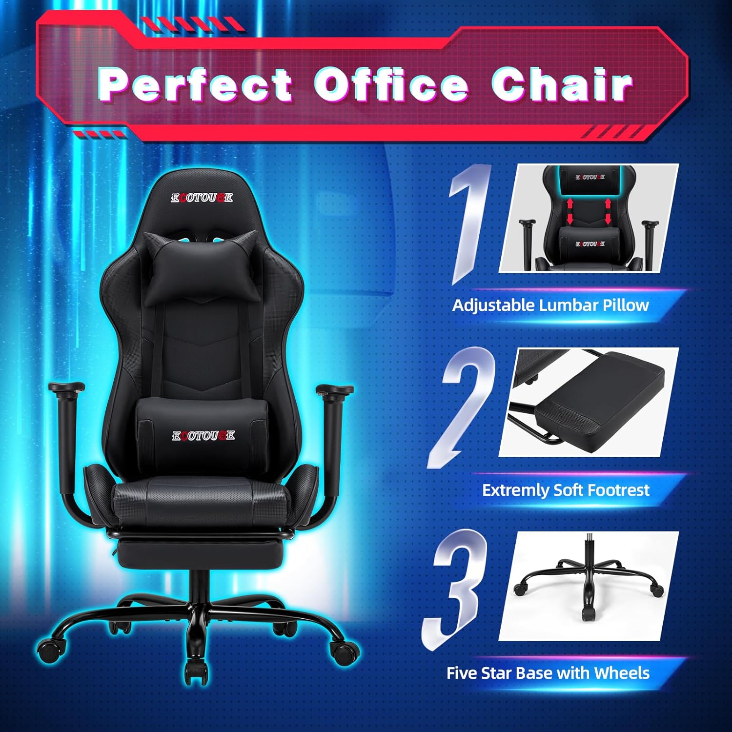 Whether you’re diving into an intense gaming marathon or tackling your daily tasks, the ECOTOUGE PC Massage Gaming Chair ensures you stay comfortable and focused. Upgrade your workspace or gaming area with this versatile chair that combines style, comfort, and functionality. Perfect for those who value both aesthetics and ergonomic design, this chair is a must-have for anyone looking to enhance their seating experience.