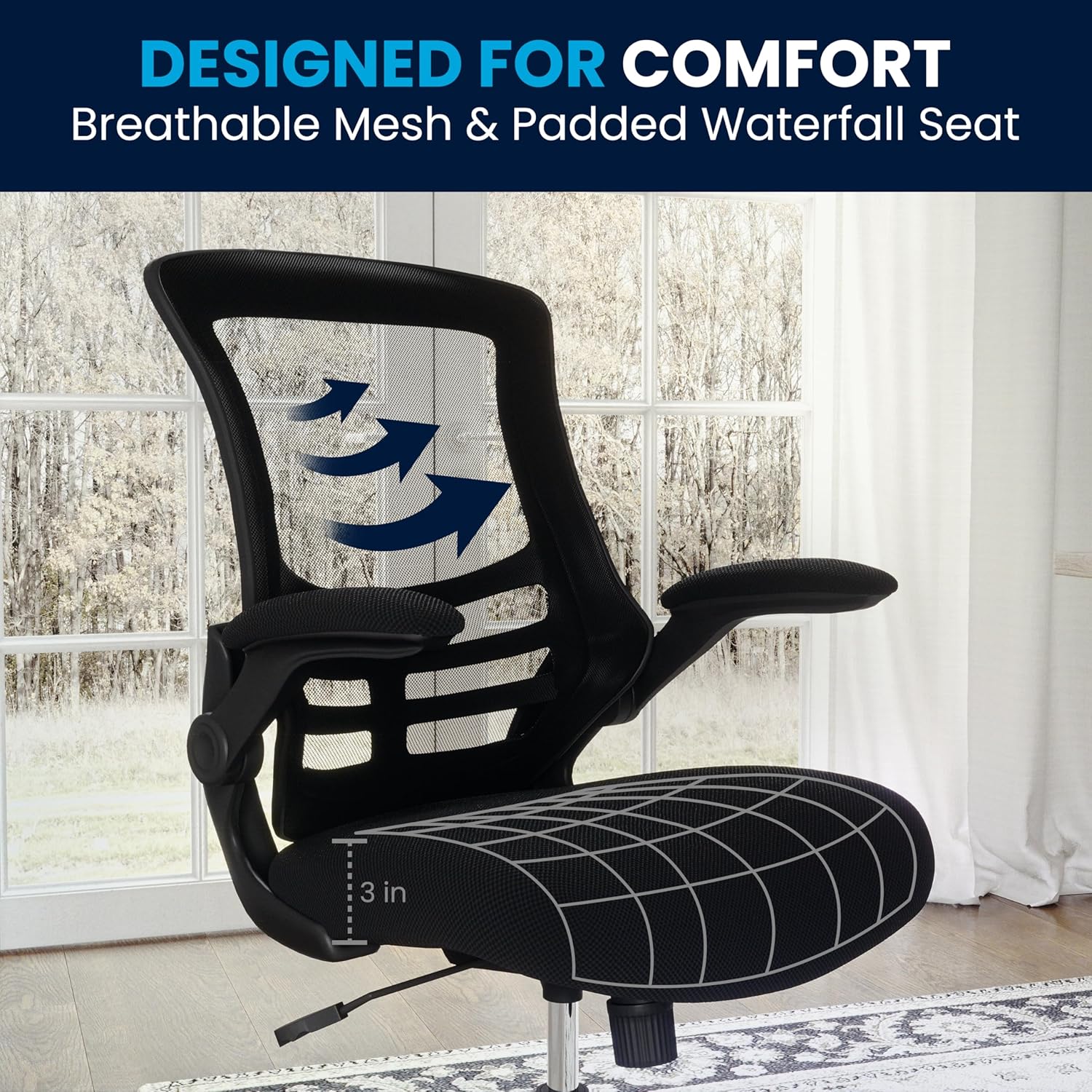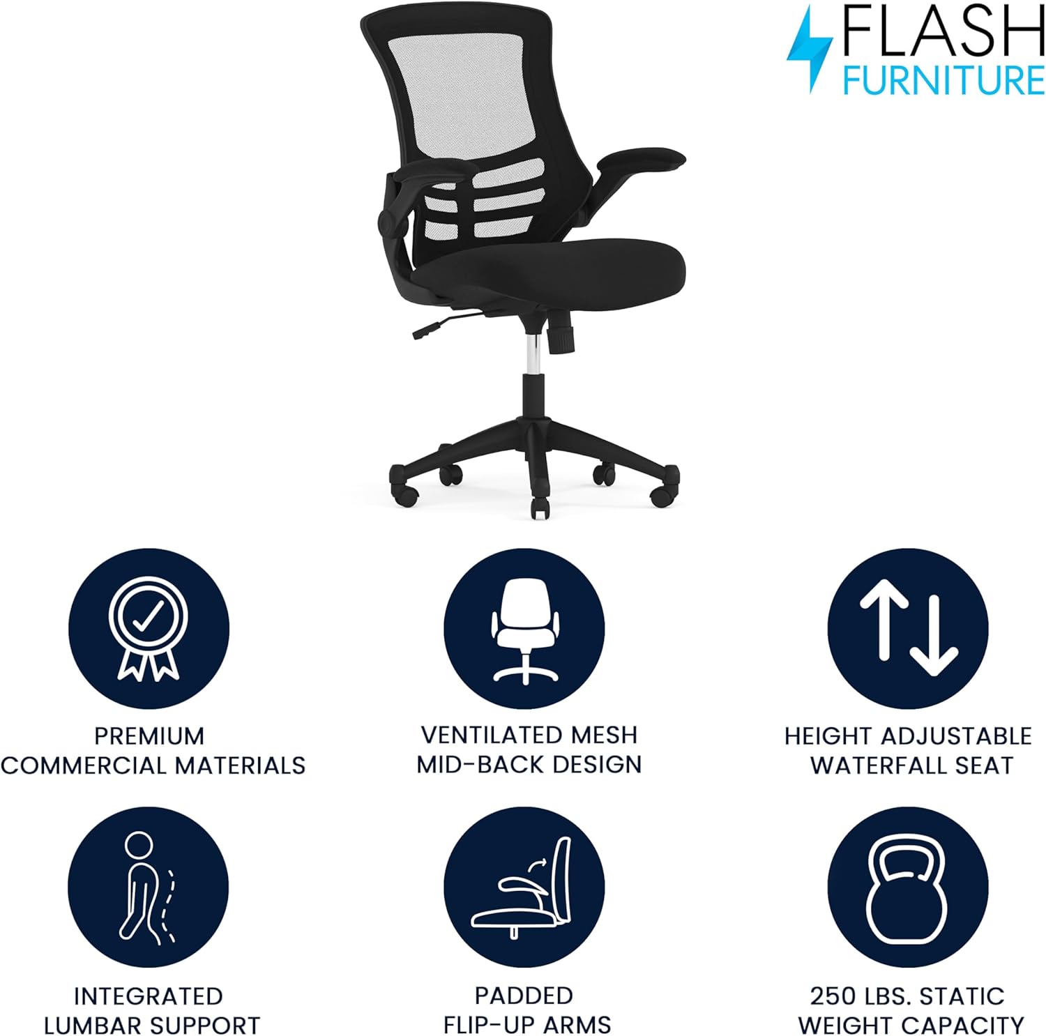 Introducing the Flash Furniture Kelista Mid-Back Swivel Office Chair, the perfect blend of style and functionality for your workspace. Designed with an ergonomic mesh back, this chair provides optimal support and breathability, ensuring you stay comfortable during long hours of work. The adjustable seat height allows you to customize your seating position for maximum comfort, while the flip-up armrests offer versatility, allowing you to easily tuck the chair under your desk when not in use.