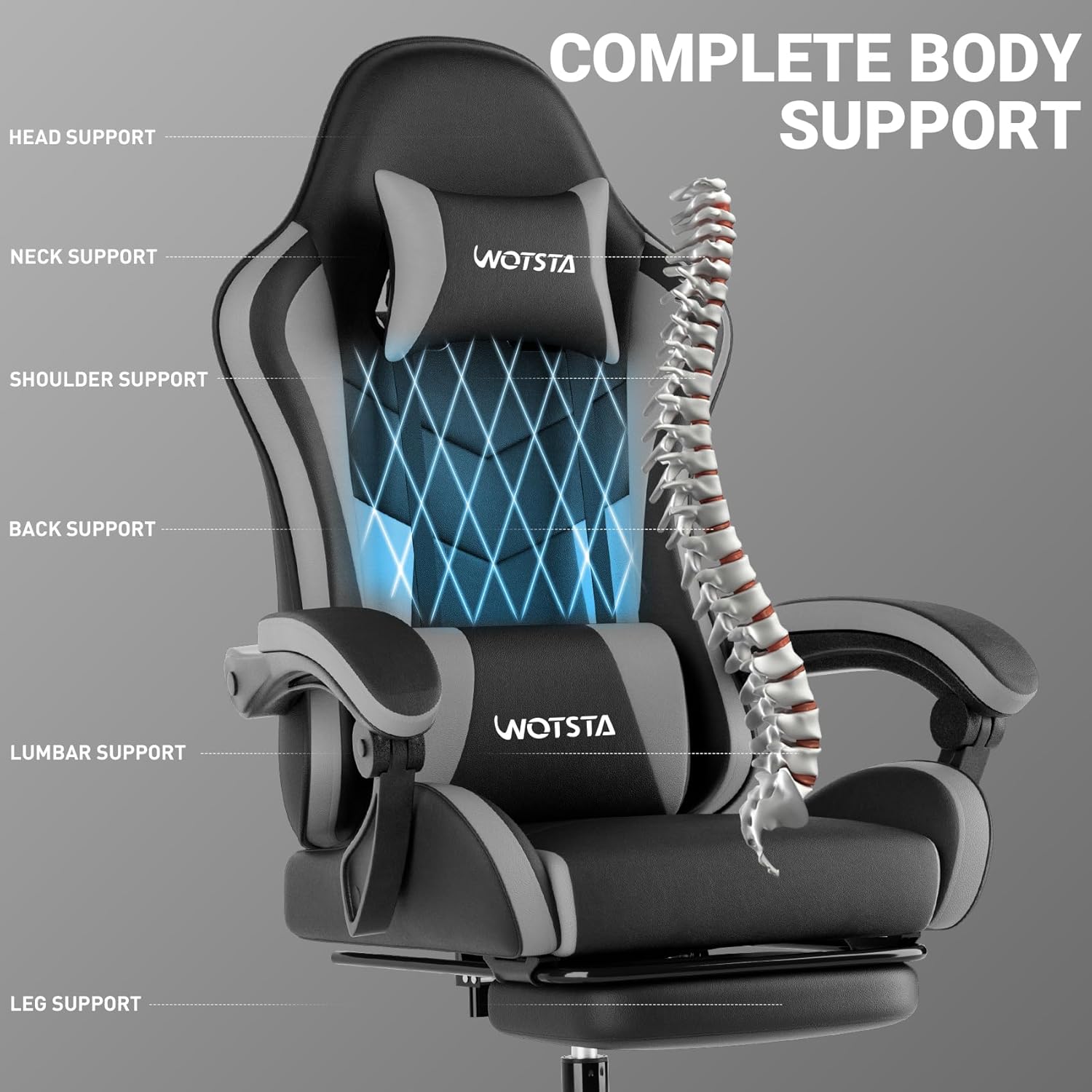 Experience ultimate comfort and support with our Gaming Chair with Footrest, designed for both avid gamers and professionals alike. This Ergonomic Gaming Chair features a sleek Black and Grey design that seamlessly fits into any office or gaming setup.
